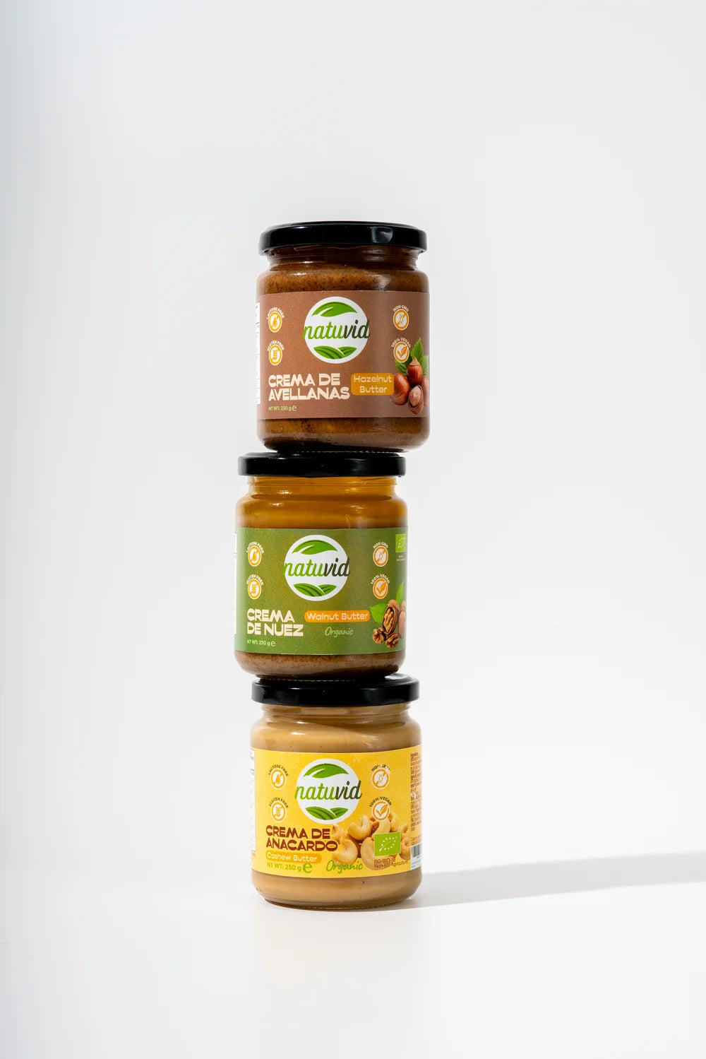 Cada crema está compuesta al 100% por el fruto seco o semilla indicada: almendra, pistacho, avellana, anacardo, cacahuete… Sin añadidos de sal, azúcar, aceites o emulgentes.